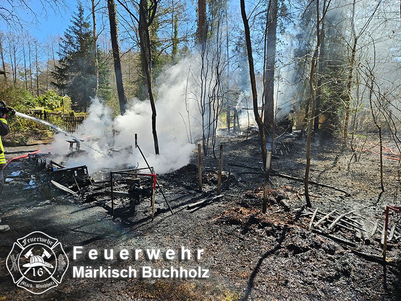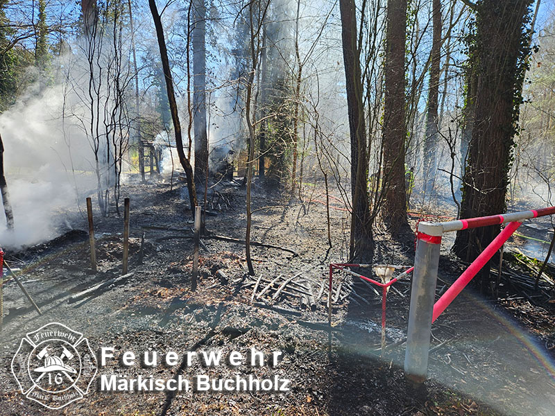 Beim Eintreffen stand ein Wohnwagen und ein kleiner Bungalow in Vollbrand. Des Weiteren hatte sich das Feuer bereits auf den umliegenden Waldboden ausgebreitet.